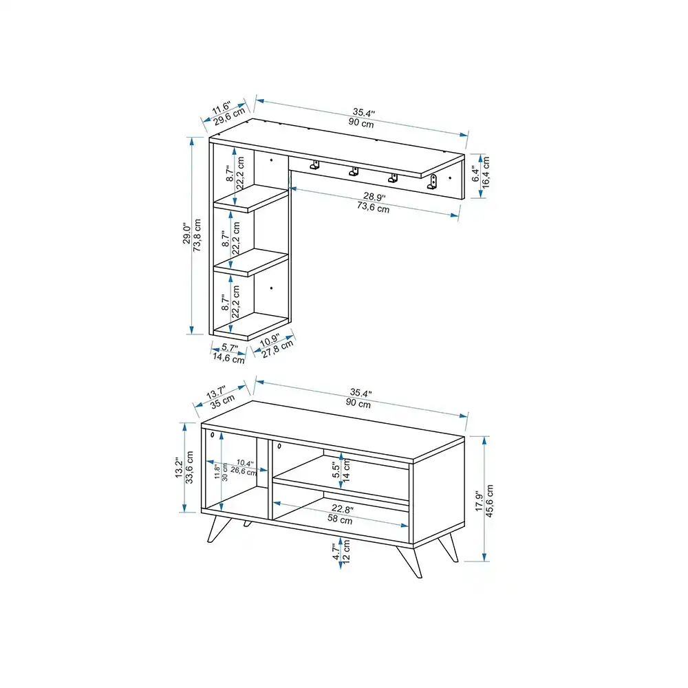 En:90 cm, Hündürlük:45,6 cm, Dərinlik:35 cm
