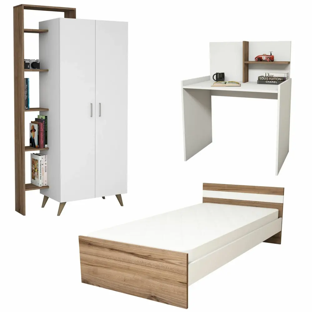 Elita Uşaq Otağı Mebel Dəsti + Çarpayı, Geyim Dolabı, Çalışma Masası, Kitab Rəfi - Ağ/Cəviz