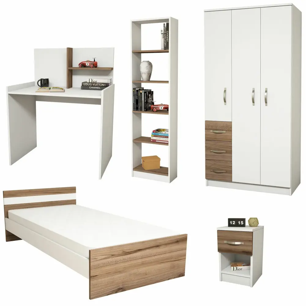 Elita Uşaq Otağı Mebel Dəsti + Çarpayı, Geyim Dolabı, Çalışma Masası, Kamod, Tumba, Kitab Rəfi - Ağ/Cəviz