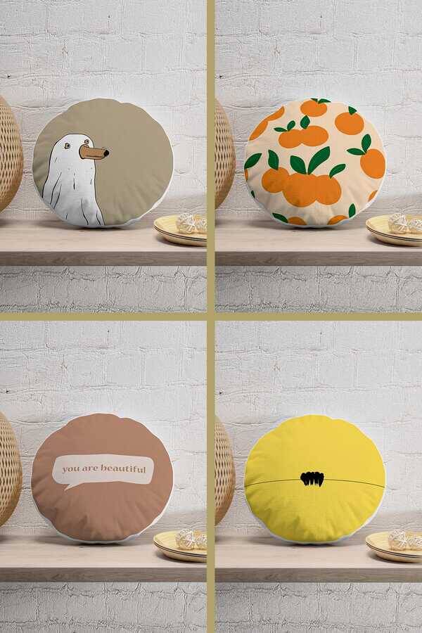 Ürün 4 adet 43*43cm yuvarlak kırlent yastık kılıfı olarak gönderilir. • Leke tutmaz özellikte mikro petek dokuma polyester kumaştan üretilmiştir. • Tasarımlarımız dijital baskı olup kullanıma ve yıkamaya bağlı olarak solma yapmaz. • Gizli fermuar sistemi ile kılıfı rahatlıkla çıkararak 30°’de makinede yıkanabilir ve ütülenebilir.