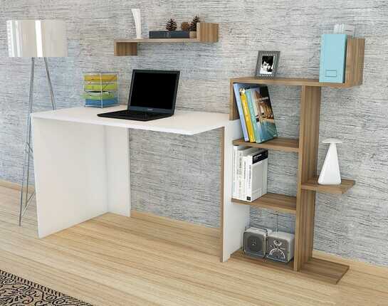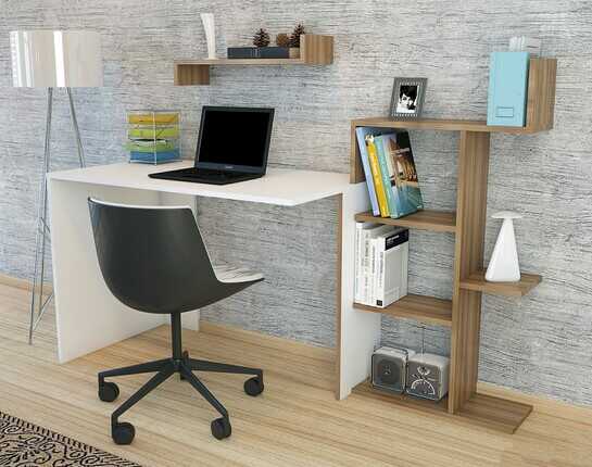 Extra Divar Rəfli Çalışma Masası və Kitab Rəfi Dəsti - Cəviz