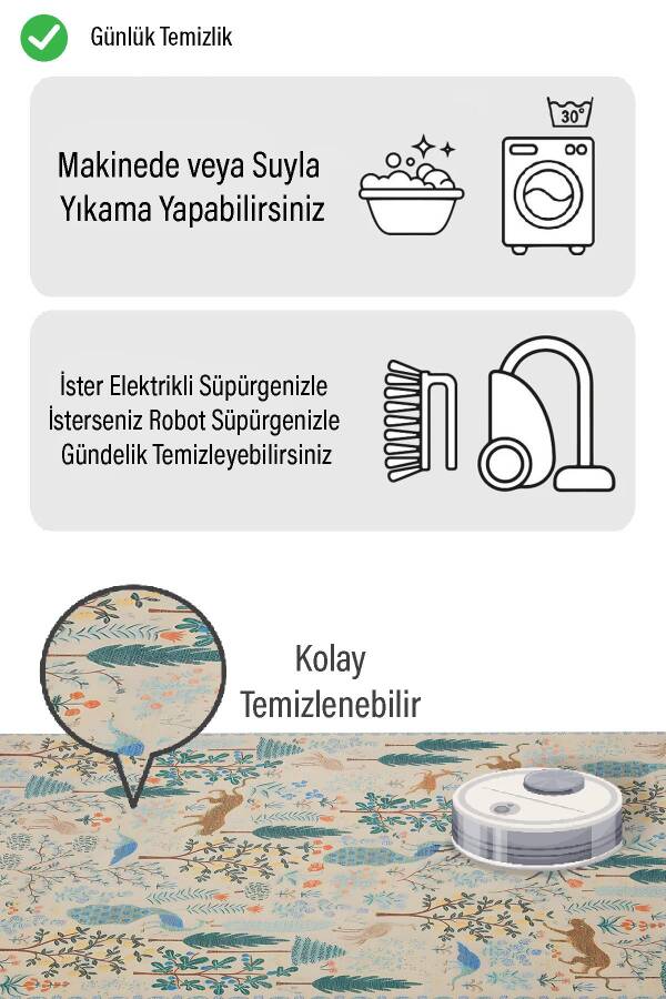 %100 yerli olarak Markaev üretim tesislerinde üretilmiştir. Tüm ürünler 2 yıl üretici garantisi kapsamındadır. En son teknoloji tezgah ve makinelerde üretilmiş ve usta ellerde işçiliği yapılmıştır. Ürünler, özenle ve hasar görmeyecek şekilde paketlenmektedir. Kaymaz Taban; Halının zemini ithal en üst kalite kaymaz keçe dot tabandan üretilmektedir. Yerde kayma, toplanma yapmaz. Olası ev kazalarını önler. Kullanılan en üst kalite malzemeler sayesinde kesinlikle zamanla parçalanma, dökülme yapmaz. Tay Tüyü Kumaş; Yumuşak dokusu sayesinde rahatlık hissi verir. Antialerjik hav çıkarmayan dokusu sayesinde çocuk odalarında rahatlıkla kullanılabilir. Antistres özelliği ile ayak altı konforunuzu en üst seviyeye taşır. Sıcak bir oda atmosferi sağlar. Kolay Temizleme; Temizliği pratik ve leke tutmayan özelliktedir. Kolay silinebilir. Çamaşır makinesinde sıkma programı olmadan 30 derecede yıkanabilir. Yıkandıktan sonra iyice kurutularak sonra ertesi gün tekrar kullanılmaya hazır hale gelir. Lekeyi yukarıda tutan özel kumaşı sayesinde tüm lekeler halı şampuanı ve bez yardımıyla kolayca silinebilir.
