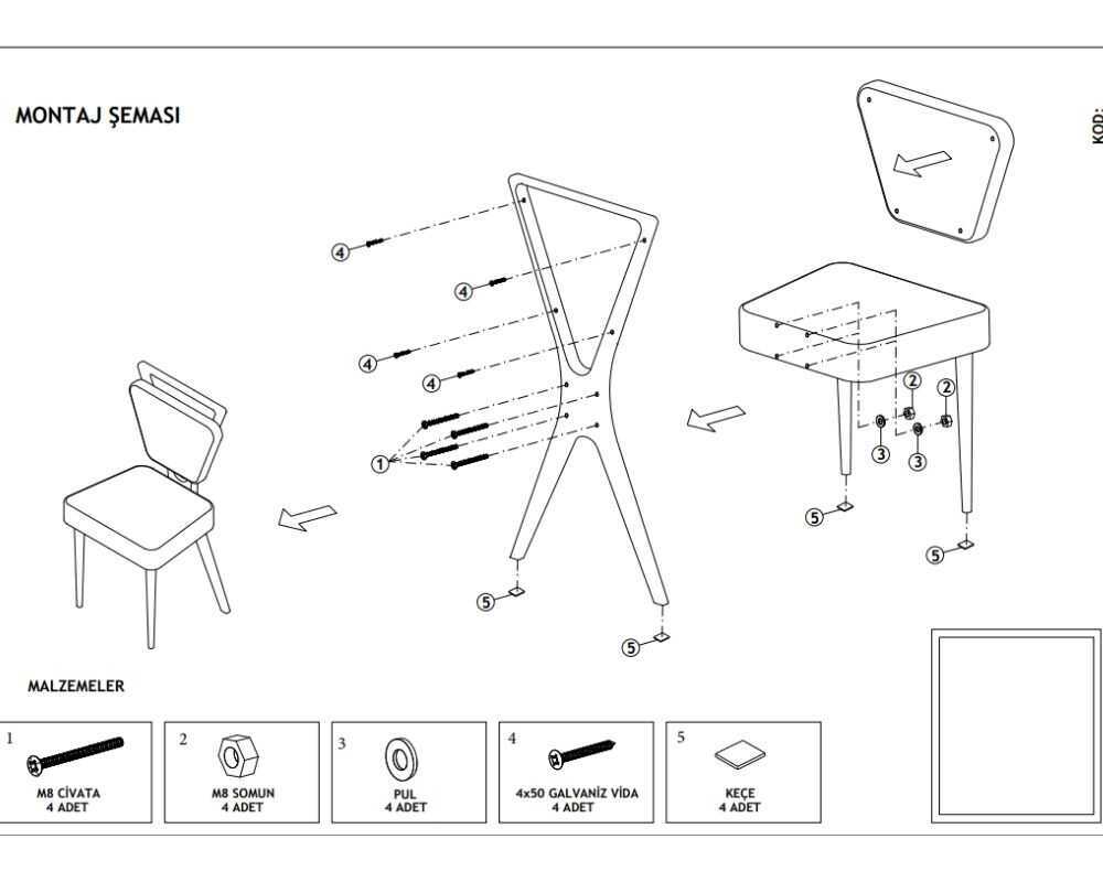 - Takım İçeriği: 1 adet Sandalye dahildir.