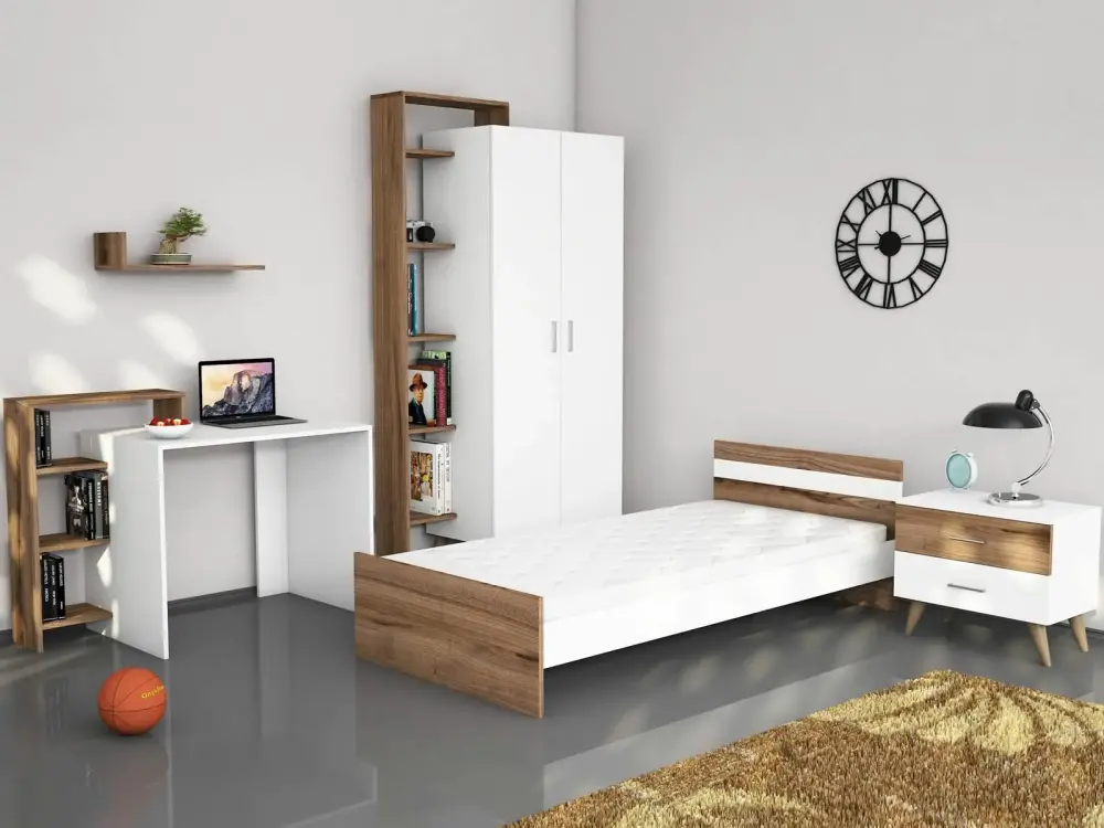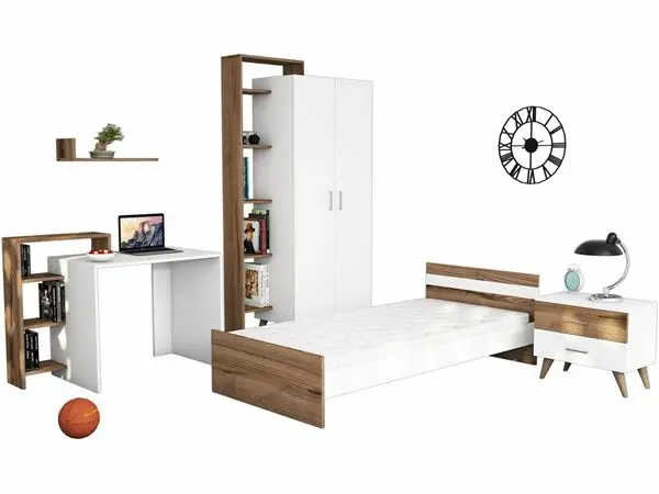 Elita Uşaq Otağı Mebel Dəsti + Çarpayı, Geyim Dolabı, Çalışma Masası, Kitab Rəfi - Ağ/Cəviz